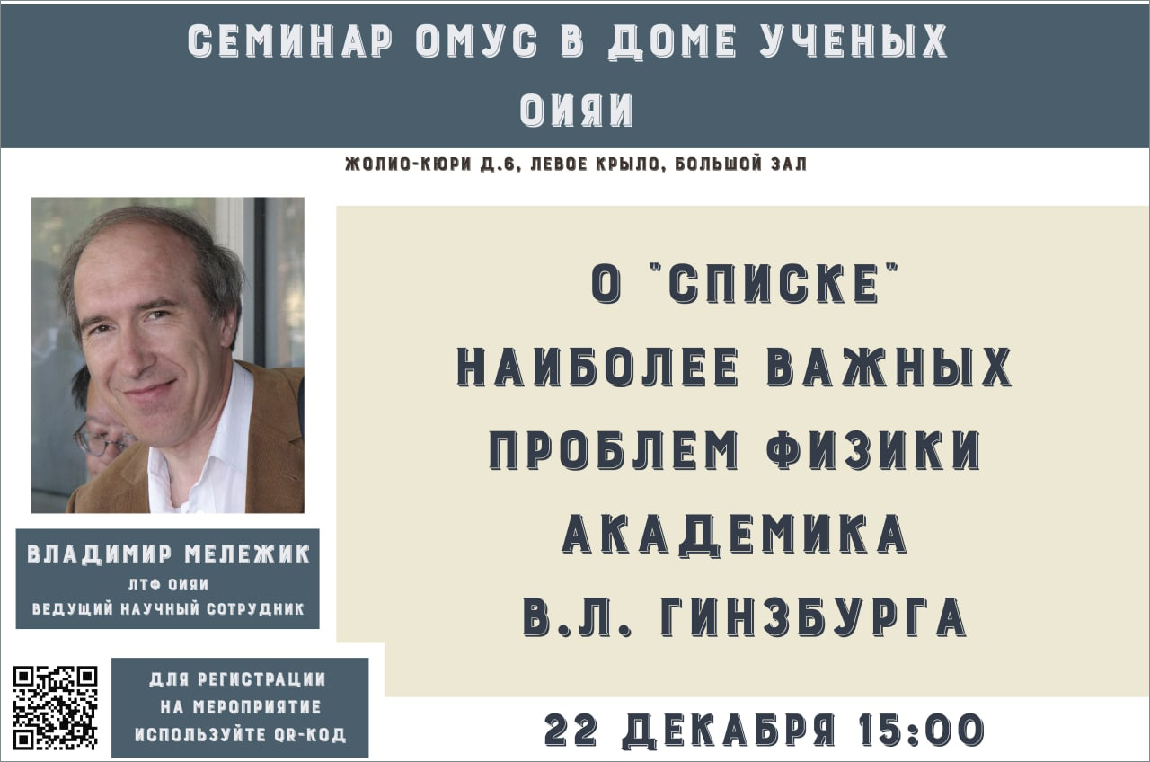 Melezhik Vladimir Stepanovich (Doctor of Physics and Mathematics, leading researcher at BLTP JINR) will make a presentation: “About the list of the most important problems of physics of Academician V. L. Ginzburg”.