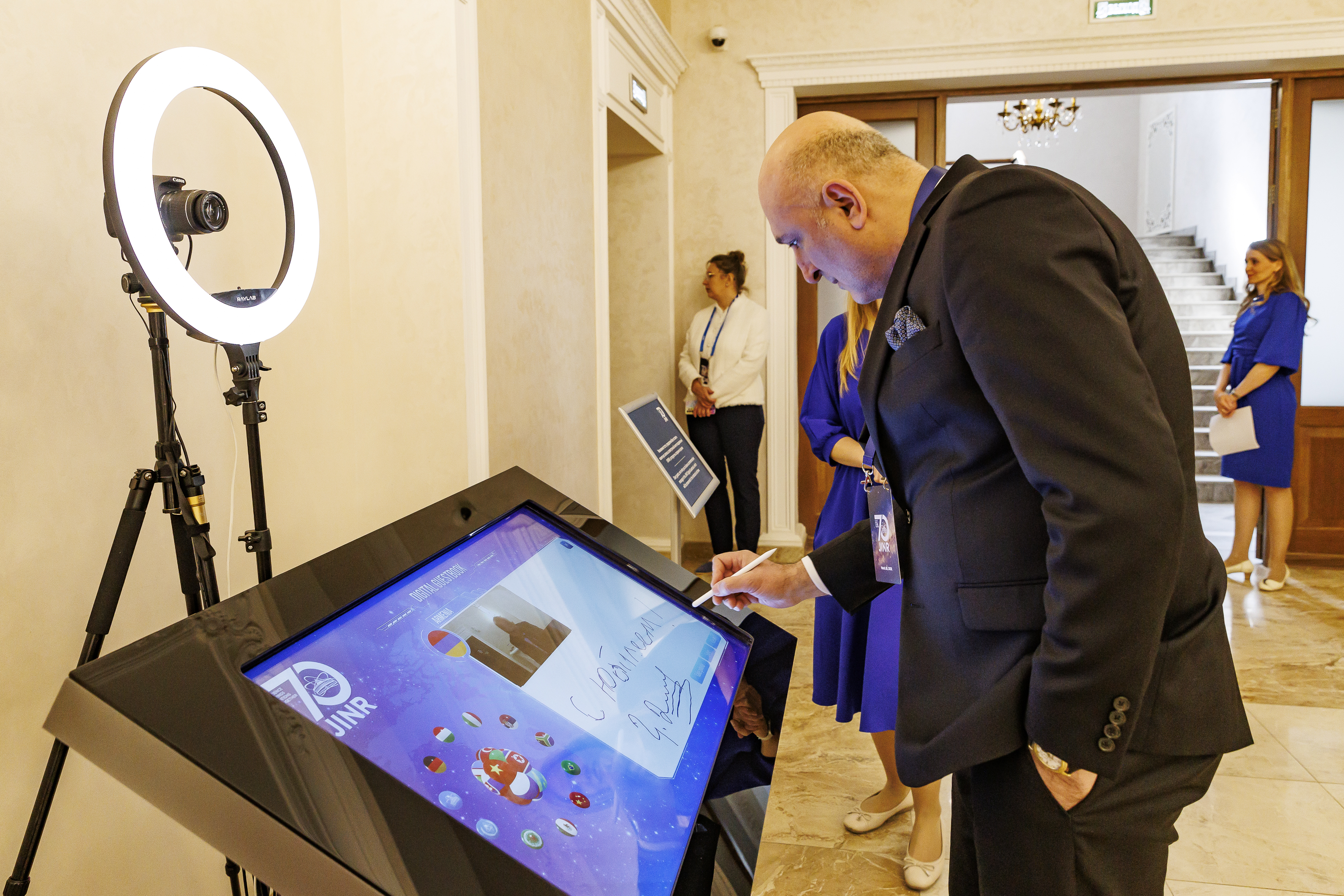 Гости также имели возможность посетить интерактивную выставку «Базовые установки ОИЯИ», которая сменила свое местоположение в пределах дома культуры. Каждый зритель праздничного вечера мог оставить памятную запись в электронной книге поздравлений ОИЯИ – поздравить Институт в цифровом формате можно было в двух киосках в фойе первого этажа.