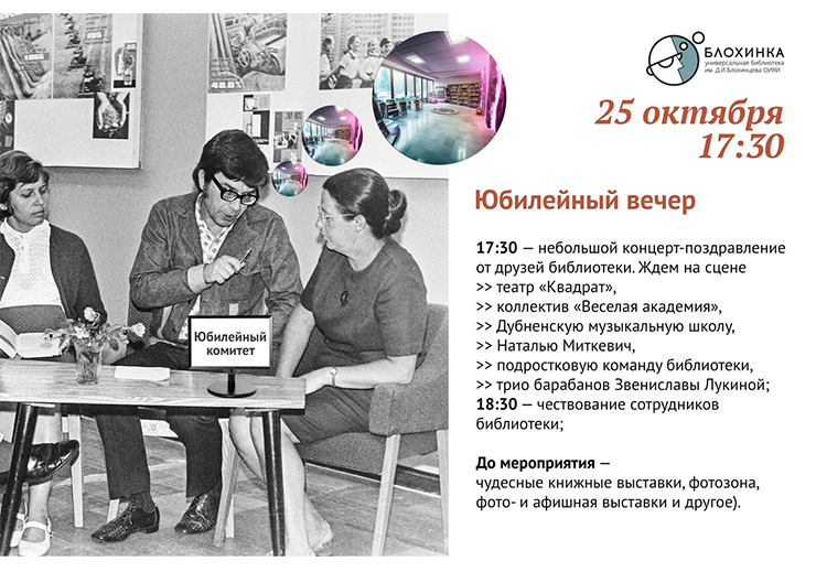 - 17:30 — концерт-поздравление. На сцене выступят: театр «Квадрат», коллектив «Веселая академия», Дубненская музыкальная школа, Наталья Миткевич, подростковая команда библиотеки с К-рор танцем и трио барабанов Звениславы Лукиной.