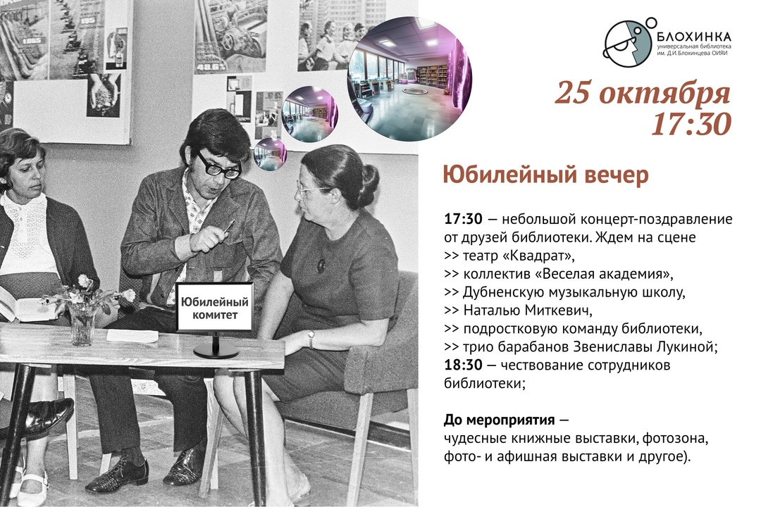 - 17:30 — концерт-поздравление. На сцене выступят: театр «Квадрат», коллектив «Веселая академия», Дубненская музыкальная школа, Наталья Миткевич, подростковая команда библиотеки с К-рор танцем и трио барабанов Звениславы Лукиной.