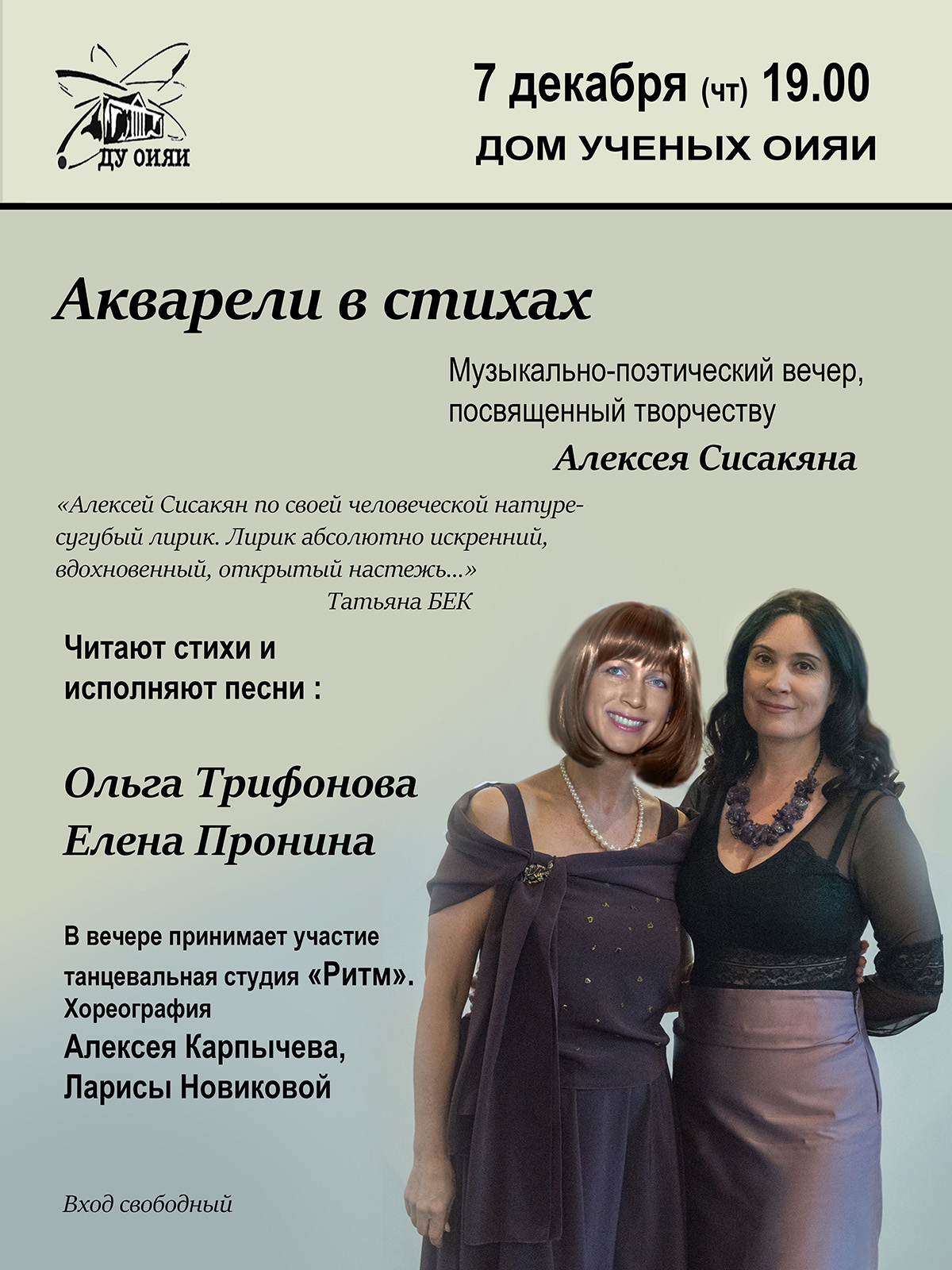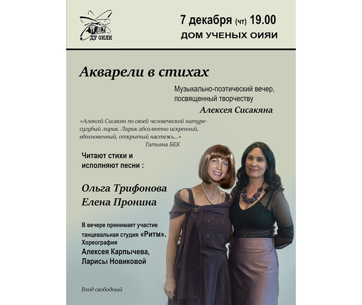 7 декабря 2023 в 19:00 Дом ученых ОИЯИ приглашает посетителей на музыкально-поэтический вечер, посвященный творчеству Алексея Сисакяна.