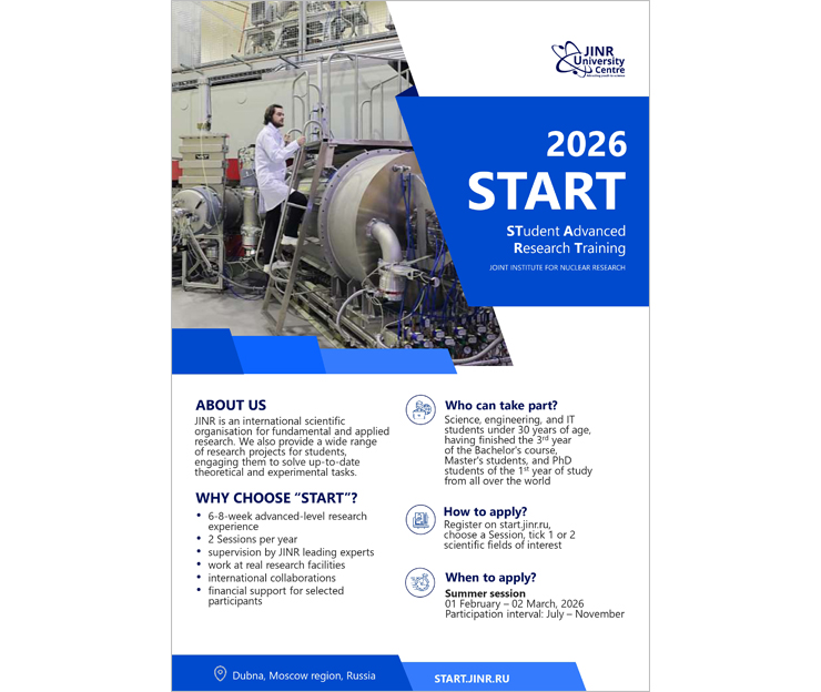 The START (STudent Advanced Research Training) programme invites students and postgraduates to join the JINR studies under the supervision of leading scientists and engineers. Applications for the 2026 summer session are accepted at start.jinr.ru from 1 February until 2 March 2026.