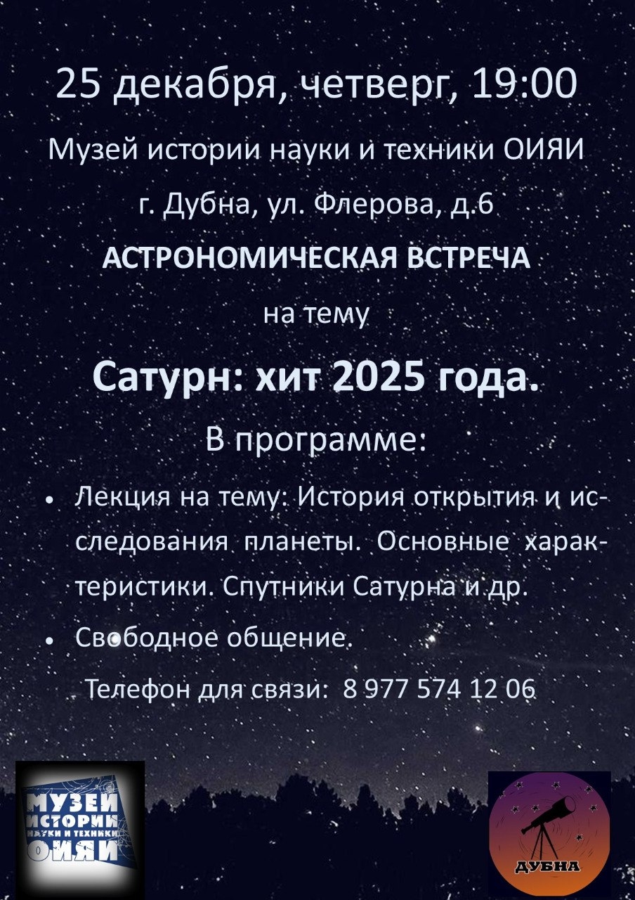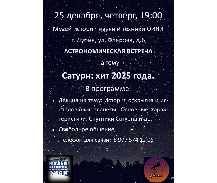 On 25 December 2025, the JINR Museum of History of Science and Technology invites all interested to the astronomical meeting entitled “Saturn: the 2025 hit”.