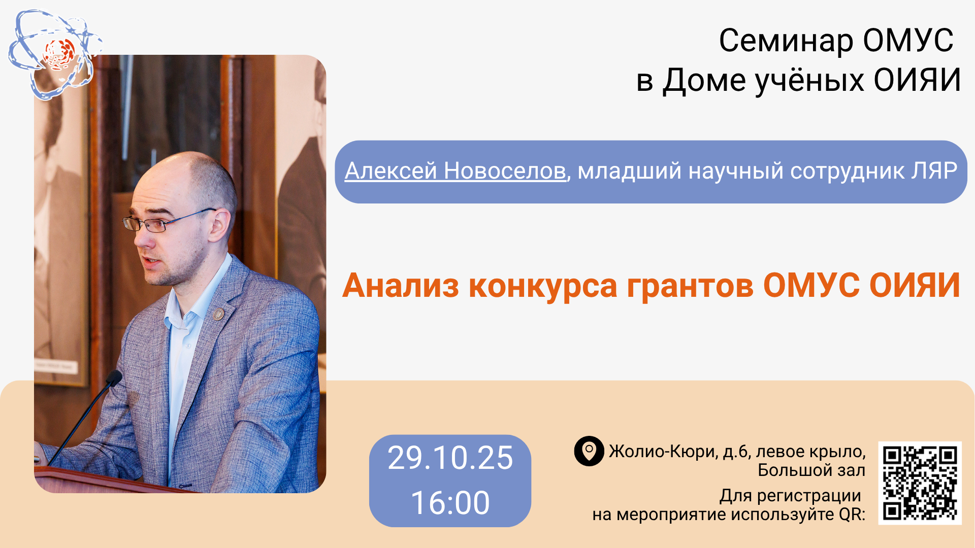 On 29 October 2025, at 4:00 PM, the Association of Young Scientists and Specialists at JINR invites everyone interested to the next seminar that will take place in the Big Hall of the JINR Scientists’ Club (6 Joliot-Curie St, left side).