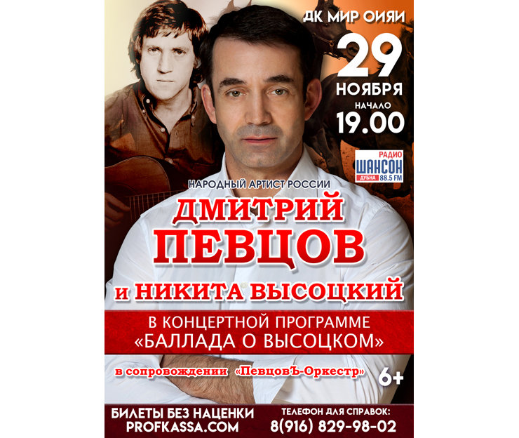 The concert will be performed by People’s artist of Russia Dmitry Pevtsov and Nikita Vysotsky accompanied by “Pevtsov Orchestra”.