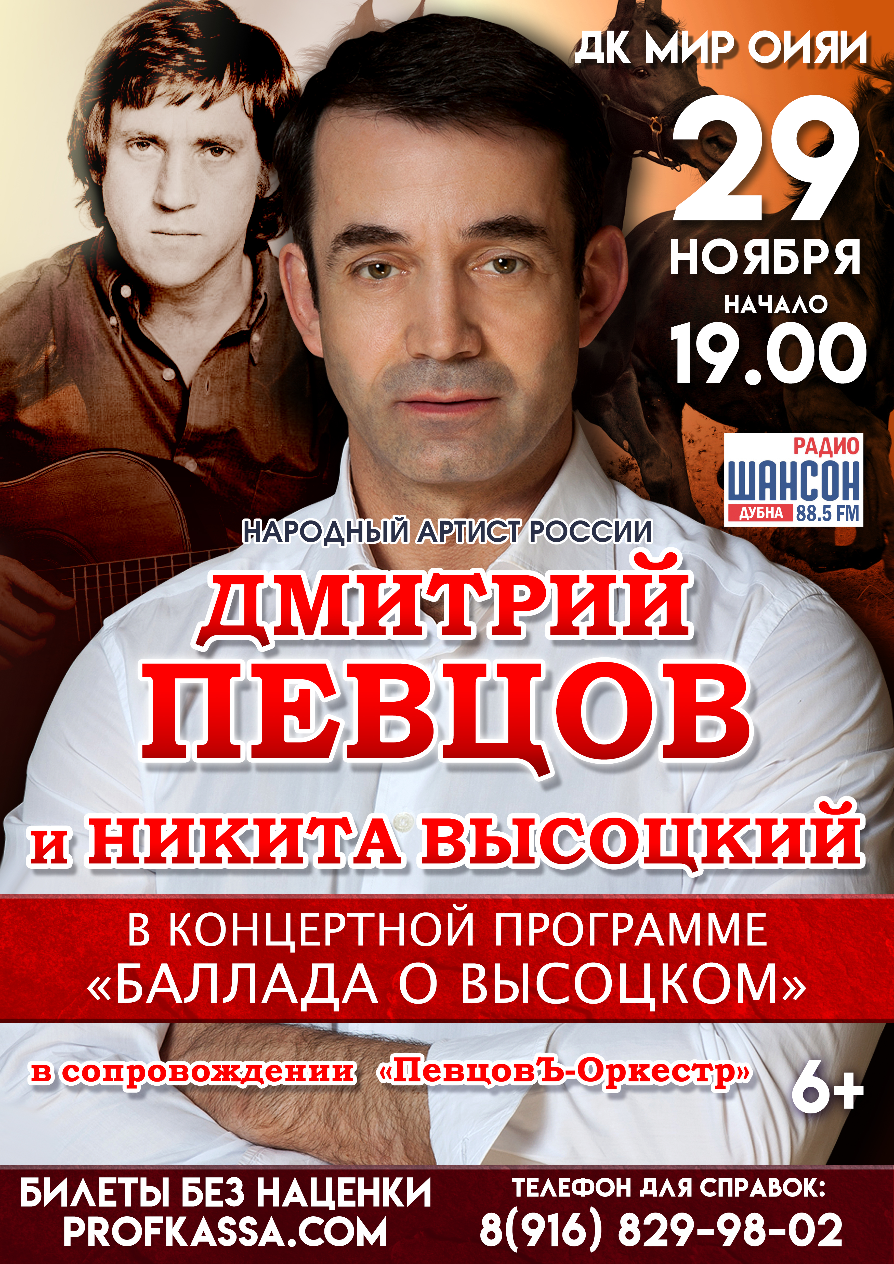 The concert will be performed by People’s artist of Russia Dmitry Pevtsov and Nikita Vysotsky accompanied by “Pevtsov Orchestra”.