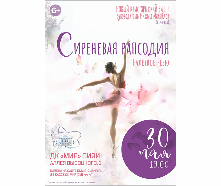 On 30 May 2023, at 7:00 PM, New Classical Ballet will present a ballet revue “Rapsody” in the JINR Cultural Centre “Mir”.