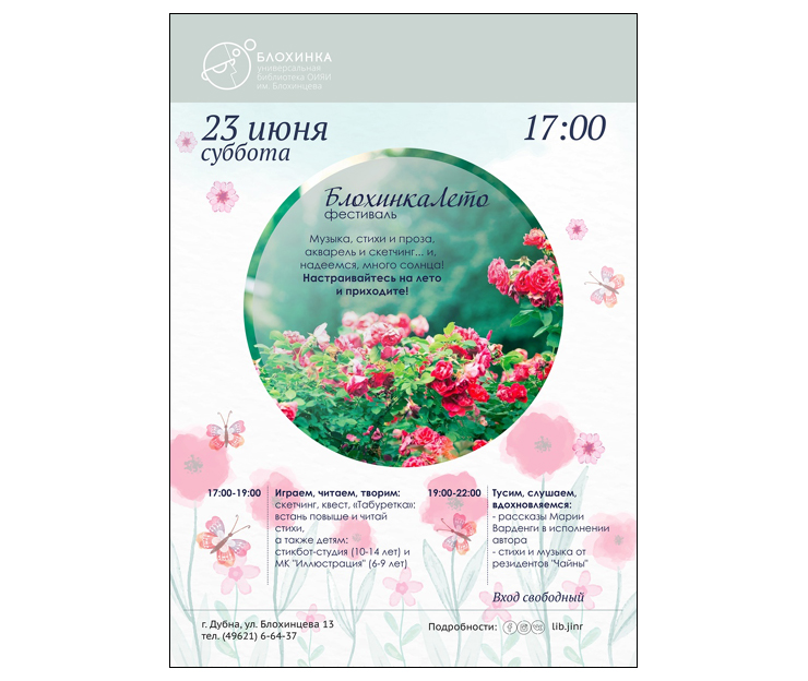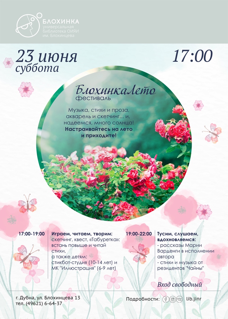 23 июня 2018 года Универсальная библиотека ОИЯИ им. Д.И. Блохинцева приглашает на мероприятие «БлохинкаЛето», которое начнется в 17:00 часов. «БлохинкаЛето» — это небольшой летний фестиваль в библиотеке: музыка, стихи, проза, скетчи, акварель, цветы, лето и открытый воздух.
