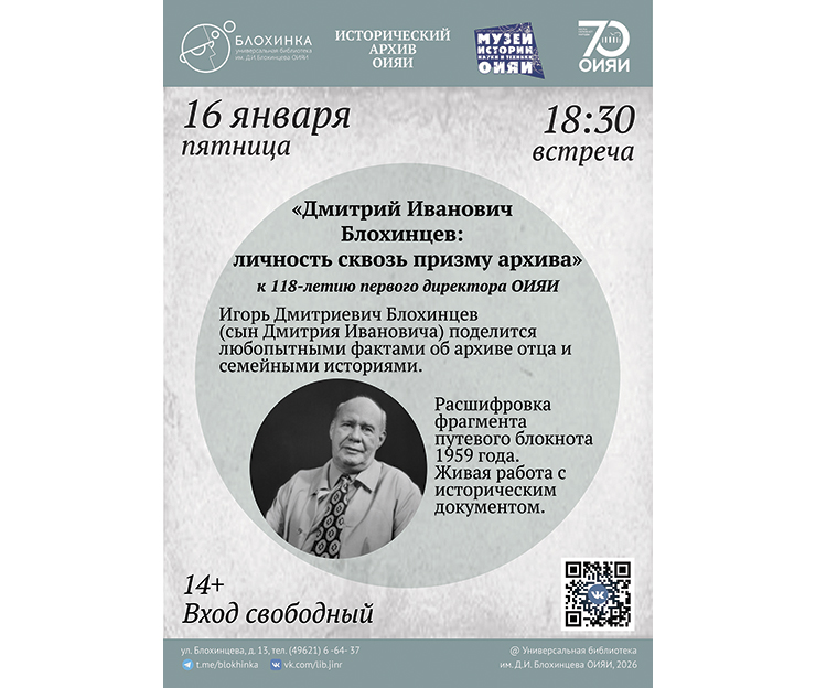 The special guest, Igor Dmitrievich Blokhintsev, will share interesting facts from his father’s archive and speak about the traditions related to celebrating the scientist’s birthdays among his family and friends. The audience will be invited to participate in transcribing a 1959 travelogue written by Dmitry Blokhintsev during his trip to China.