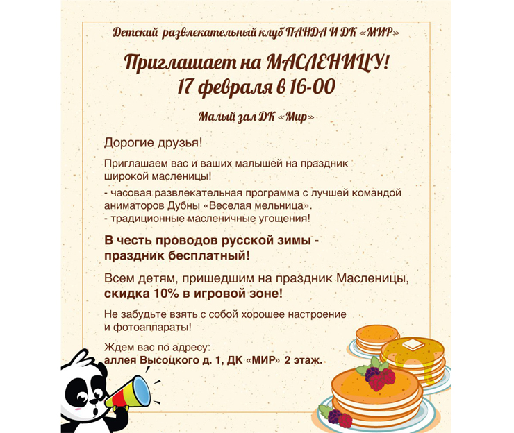 On 17 February 2018 at 4.00 PM, the JINR Cultural Centre “Mir” and the Entertaining Club for Children “Panda” invite to the Small Hall of the Centre to celebrate Maslenitsa.