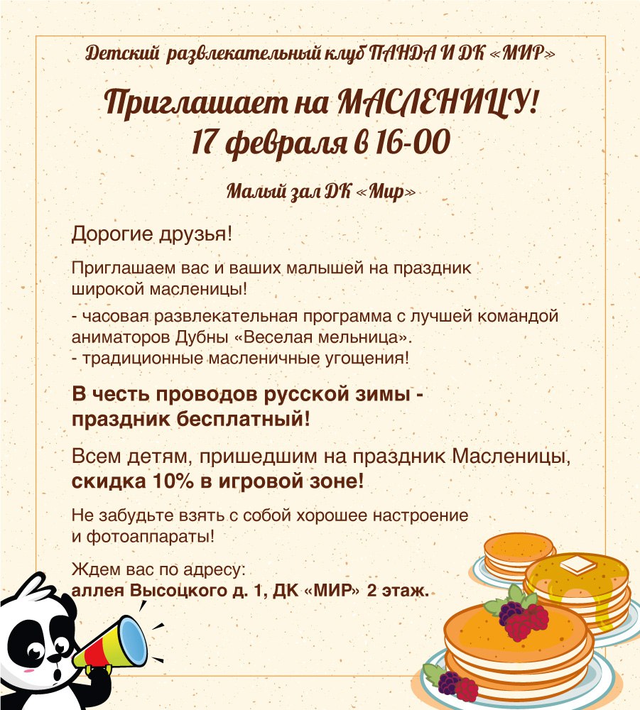 On 17 February 2018 at 4.00 PM, the JINR Cultural Centre “Mir” and the Entertaining Club for Children “Panda” invite to the Small Hall of the Centre to celebrate Maslenitsa.