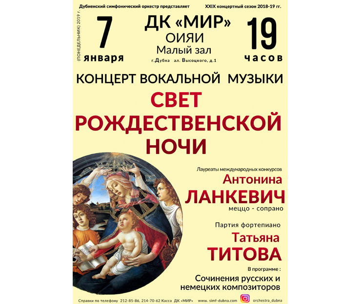 The JINR Cultural Centre “Mir” invites to the Christmas concert “The light of the Christmas night” of the Dubna Symphony Orchestra on 7 January 2019. The start of the concert is set at 5:00 PM.