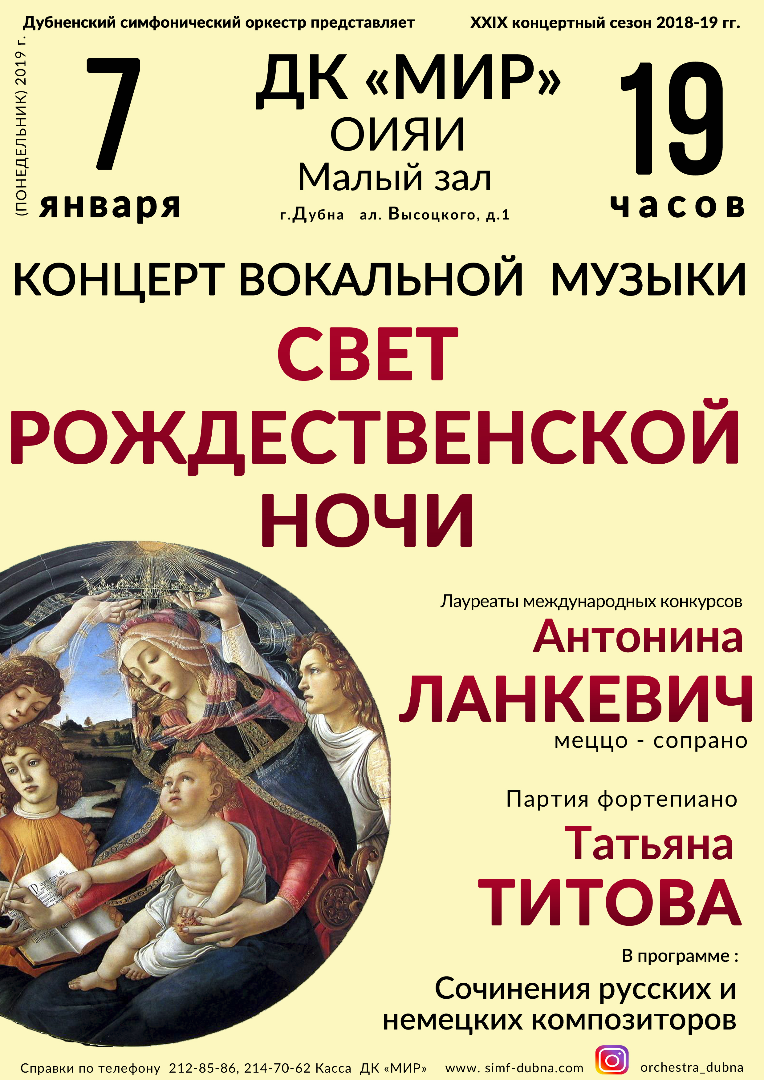 The JINR Cultural Centre “Mir” invites to the Christmas concert “The light of the Christmas night” of the Dubna Symphony Orchestra on 7 January 2019. The start of the concert is set at 5:00 PM.