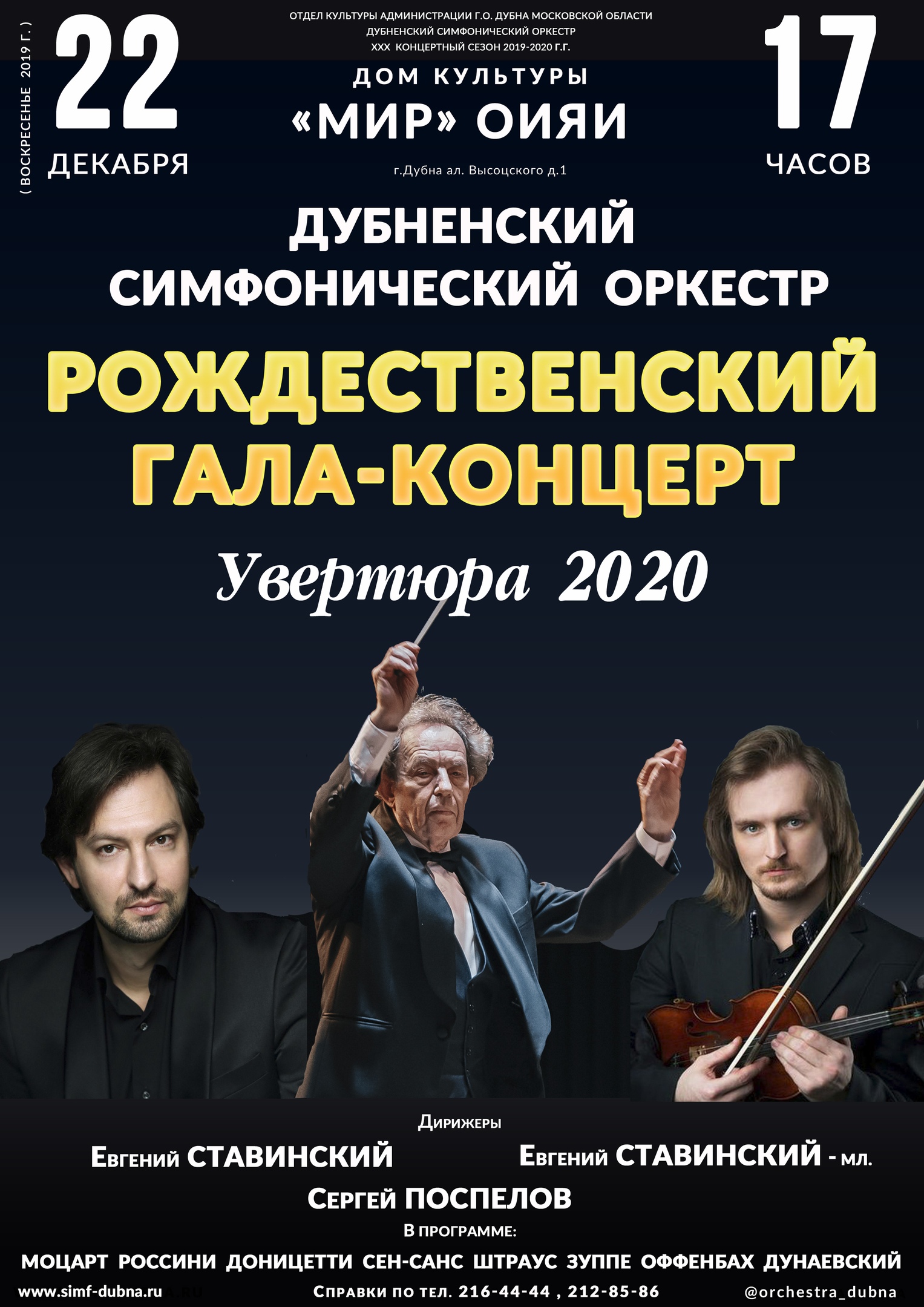 On 22 December 2019, at 5:00 PM, the Dubna Symphony Orchestra invites to the JINR Cultural Centre “Mir” for a Christmas gala-concert “Ouverture-2020”.