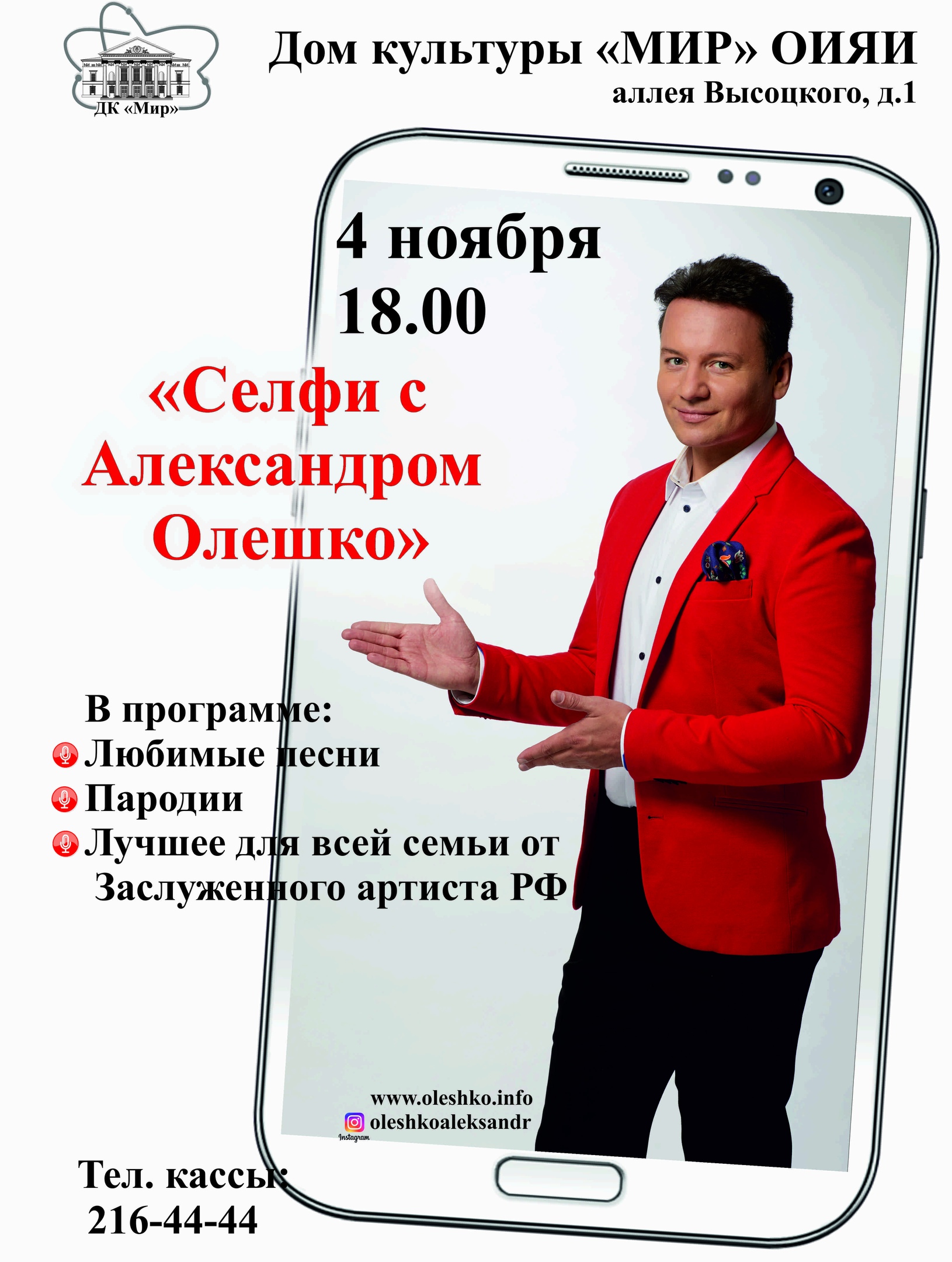 On 4 November 2019, at 6:00 PM, the JINR Cultural Centre “Mir” invites to the concert “Selfie with Alexander Oleshko”.