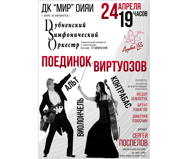 On 24 April 2021, the JINR Cultural Centre “Mir” will host a concert of the Dubna Symphony Orchestra “Duel of virtuosos”. Band director: Sergey Pospelov.
