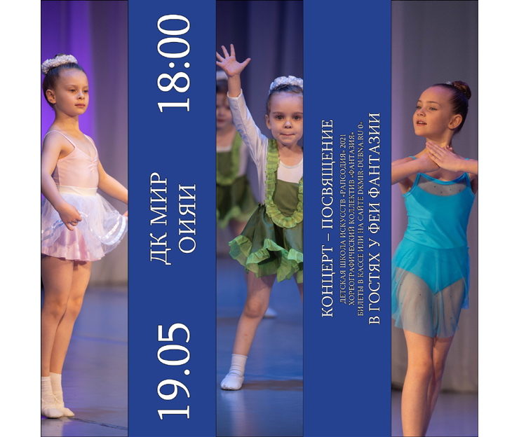 On 19 May 2021, the dance troupe “Fantasia” of the Children’s Art School “Rapsody” invites to the JINR Cultural Centre “Mir” for its concert “Visiting the fairy Fantasy”. The rite of passage for new dancers of the studio.