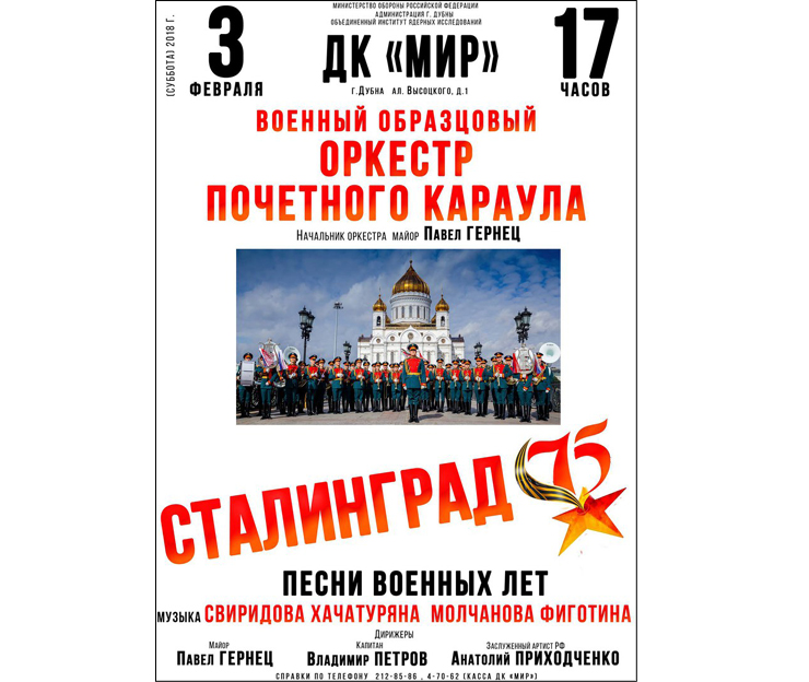 The JINR Cultural Centre “Mir” invites to the concert prepared by the Military Exemplary Band of the Honor Guard. The concert will be held on Sunday, 3 February 2018, at 5:00 PM.