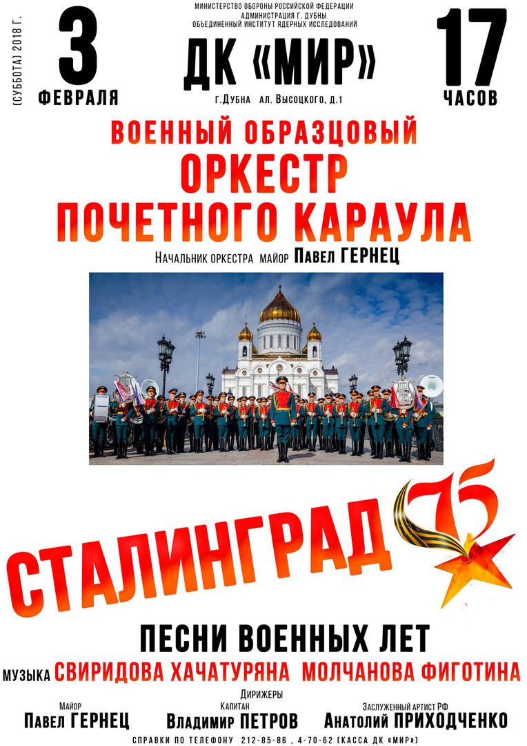 The JINR Cultural Centre “Mir” invites to the concert prepared by the Military Exemplary Band of the Honor Guard. The concert will be held on Sunday, 3 February 2018, at 5:00 PM.