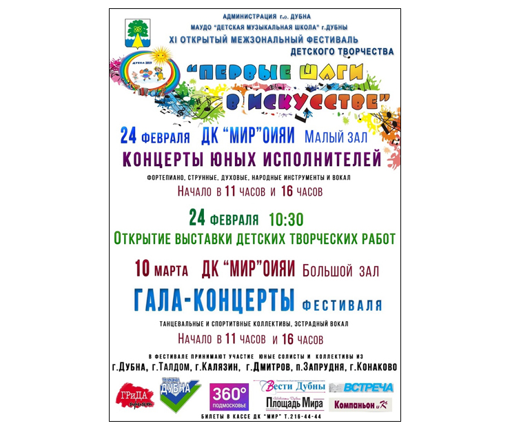 On 24 February 2019, the JINR Cultural Centre “Mir” invites to the concert of young performers in the frames of the festival “First steps in the arts” (Small concert hall). Start of performances is set on 11:00 AM and 6:00 PM.