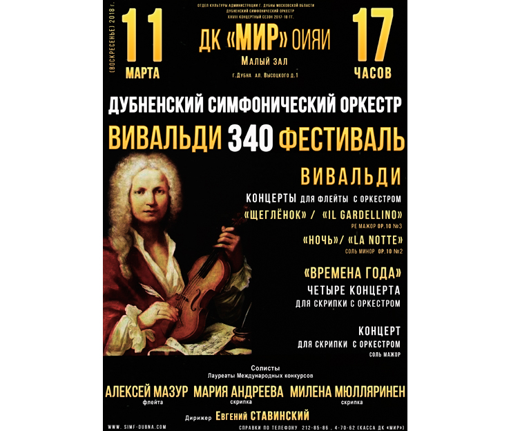 On 11 March 2018, at 5.00 PM, the JINR Cultural Centre “Mir” invites to the concert continuing the Vivaldi Festival that will be held in the small concert hall of the Cultural Centre.
