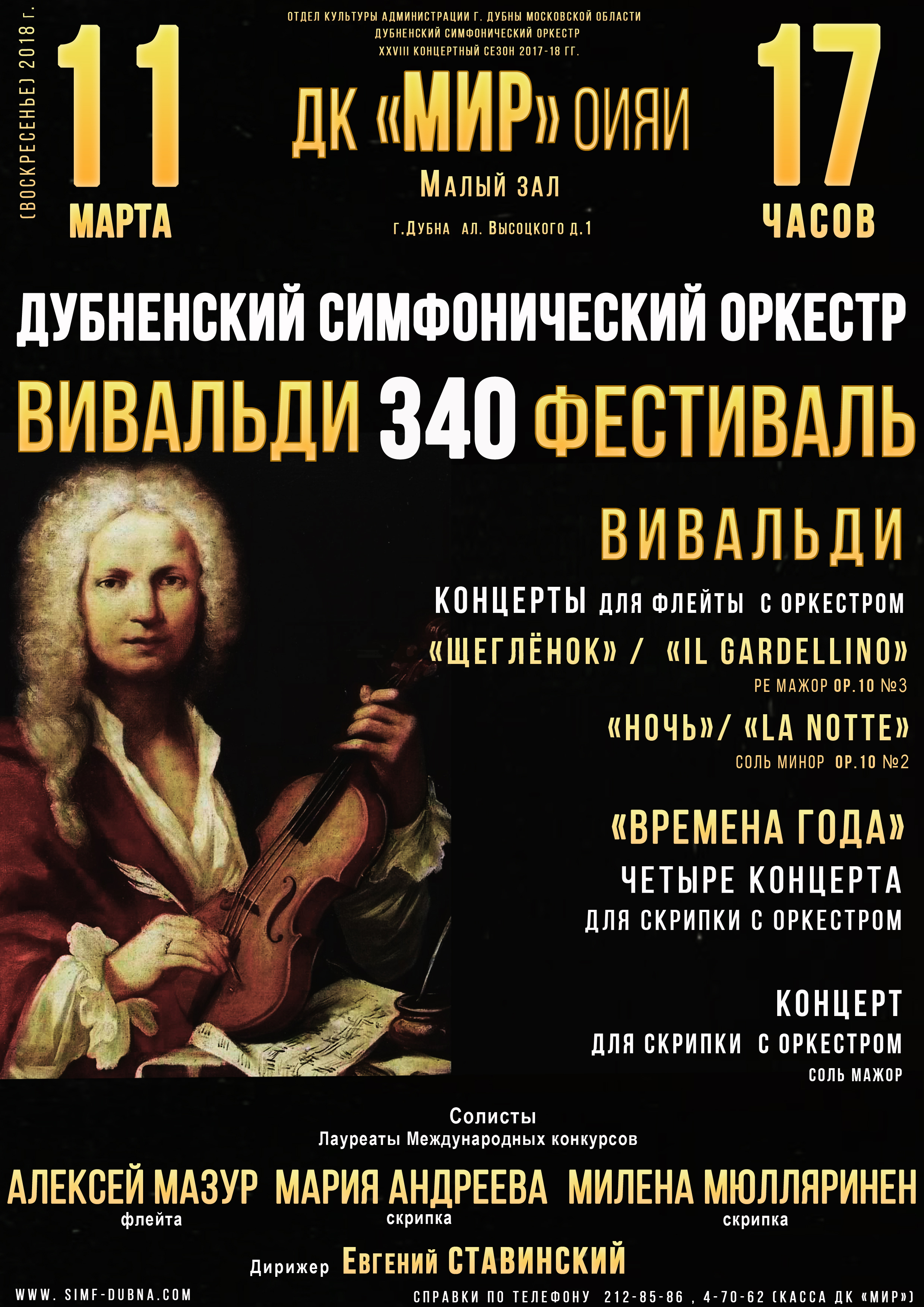 On 11 March 2018, at 5.00 PM, the JINR Cultural Centre “Mir” invites to the concert continuing the Vivaldi Festival that will be held in the small concert hall of the Cultural Centre.