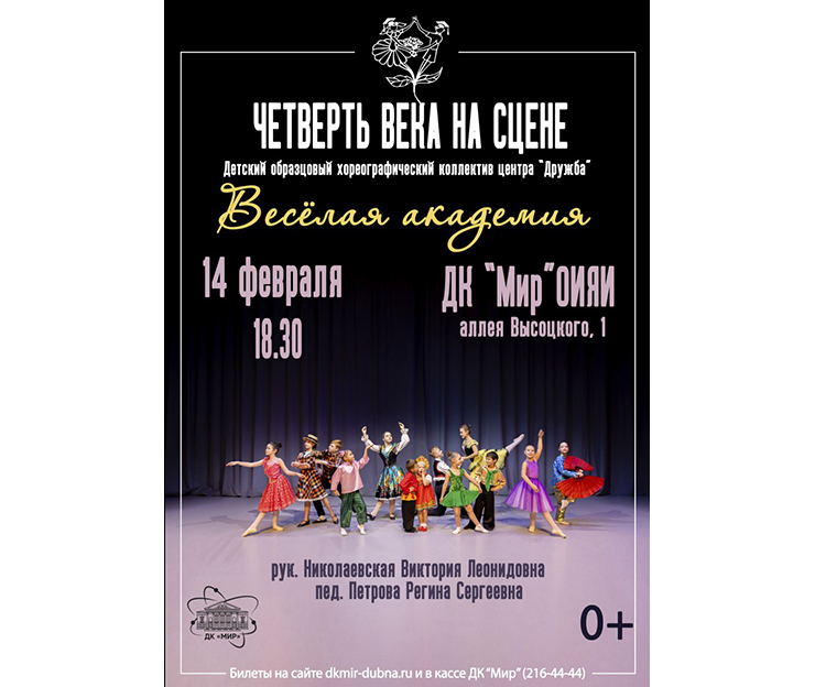 For any inquiries please contact +7 (496) 216-44-44 (ticket office). Tickets are available on the website dkmir-dubna.ru, at the Cultural Centre ticket office, and at the Mayak Shopping Centre ticket booth.