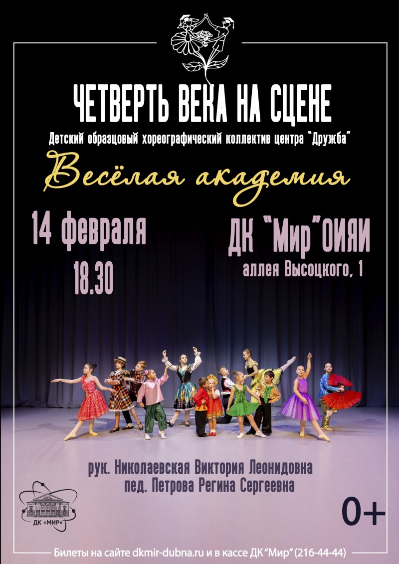 For any inquiries please contact +7 (496) 216-44-44 (ticket office). Tickets are available on the website dkmir-dubna.ru, at the Cultural Centre ticket office, and at the Mayak Shopping Centre ticket booth.