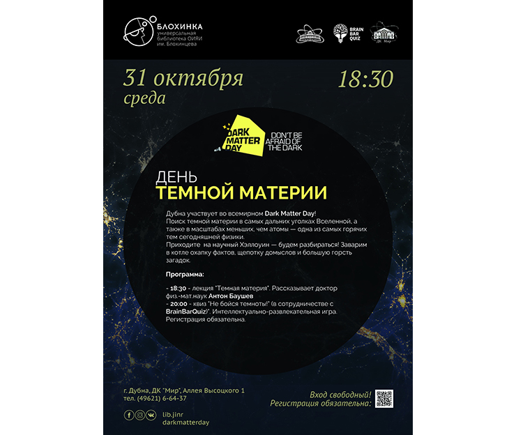 On 31 October 2018, at 7.00 PM, the JINR Universal Public Library will hold the “Dark Matter Day”, the international holiday of popularization of science.