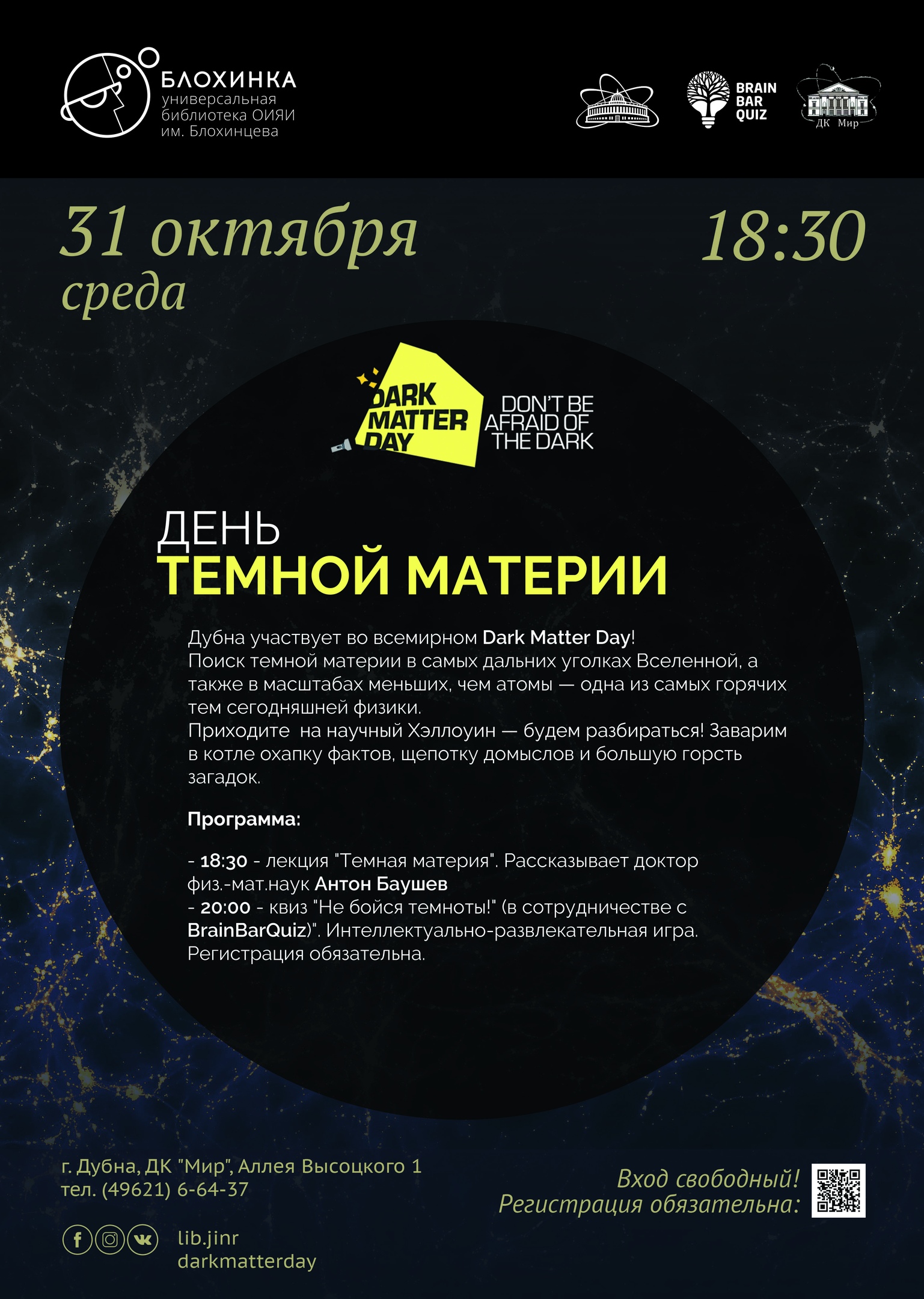 His scientific interests cover the origin of hidden mass of the Universe. Short lectures on dark matter by Anton Baushev are available on the Postnauka web-site. - 8:00 PM – quiz “Don’t be afraid of the dark!” (in cooperation with BrainBarQuiz).