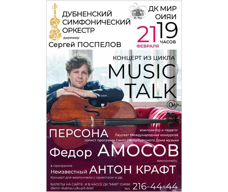 On 21 February 2024, at 7:00 PM, the JINR Cultural Centre “Mir” invites everyone interested to a cello сoncerto from the “Music talk” series by the Dubna Symphony Orchestra.