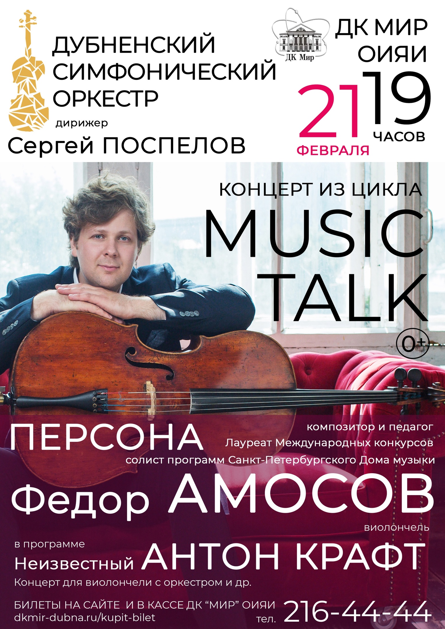 On 21 February 2024, at 7:00 PM, the JINR Cultural Centre “Mir” invites everyone interested to a cello сoncerto from the “Music talk” series by the Dubna Symphony Orchestra.