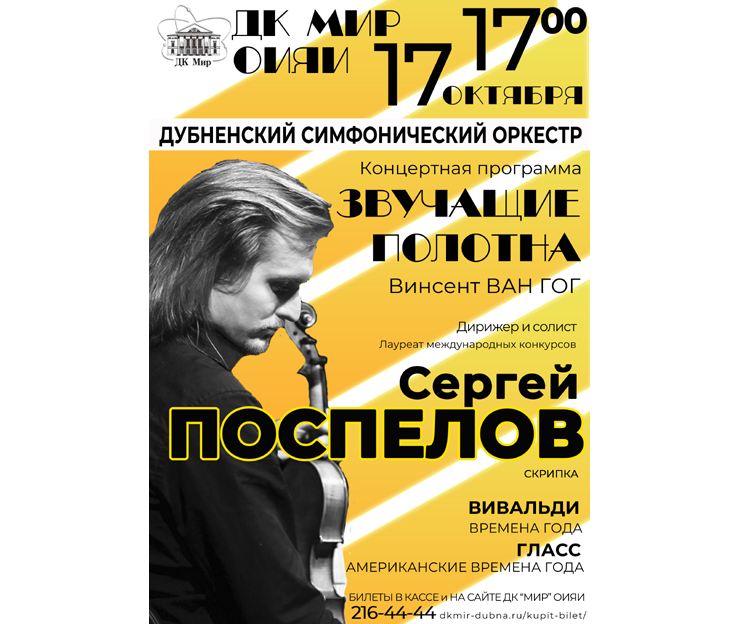 On 17 October 2020, at 5:00 PM, JINR Cultural Centre “Mir” invites to a concert by a chamber ensemble of the Dubna Symphony Orchestra “Sounding canvases: Van Gogh. The Seasons: Antonio Vivaldi and Philip Glass”.