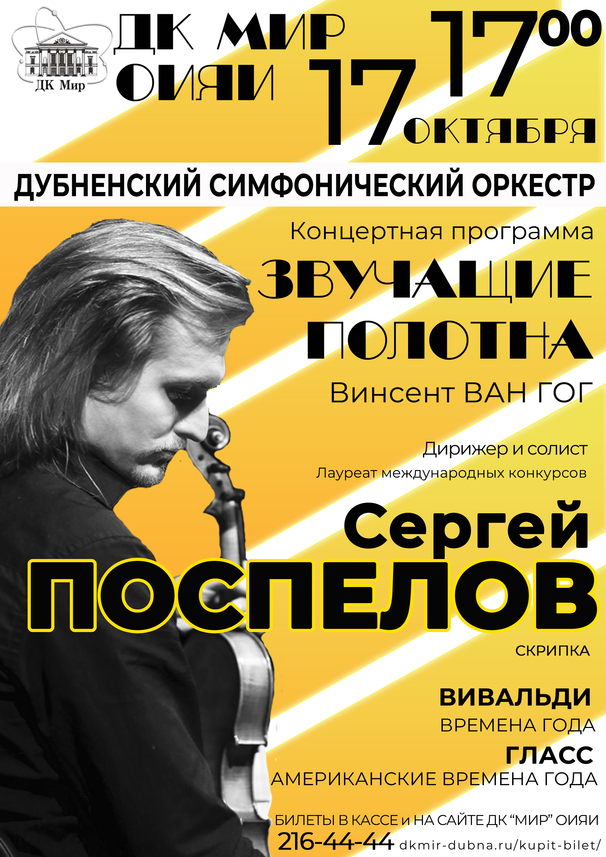 On 17 October 2020, at 5:00 PM, JINR Cultural Centre “Mir” invites to a concert by a chamber ensemble of the Dubna Symphony Orchestra “Sounding canvases: Van Gogh. The Seasons: Antonio Vivaldi and Philip Glass”.