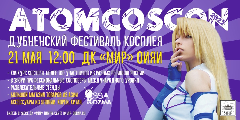 Дом культуры «Мир» ОИЯИ приглашает на Дубненский фестиваль косплея «AtomCosCon-2022», который состоится 21 мая 2022 г. в 12:00 часов.