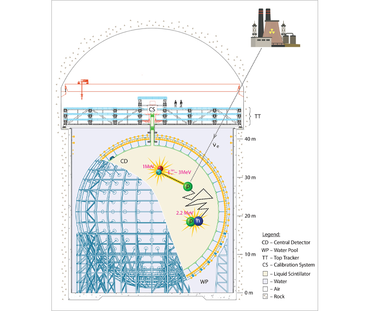 Многолетние исследования и разработки участников коллаборации привели к созданию фотоэлектронных умножителей высокой эффективности и прецизионных систем калибровки, технологий получения жидкого сцинтиллятора повышенной прозрачности и изготовления конструкции из материалов с низким содержанием радиоактивных примесей. В центре детектора JUNO — акриловая сфера диаметром 35,4 метра, которая удерживает 20 тысяч тонн жидкого сцинтиллятора. Сфера окружена более чем 20 тысячами больших и 25 тысячами малых фотоумножителей, погруженных в 44-метровый бассейн со сверхчистой водой для защиты от мюонов.