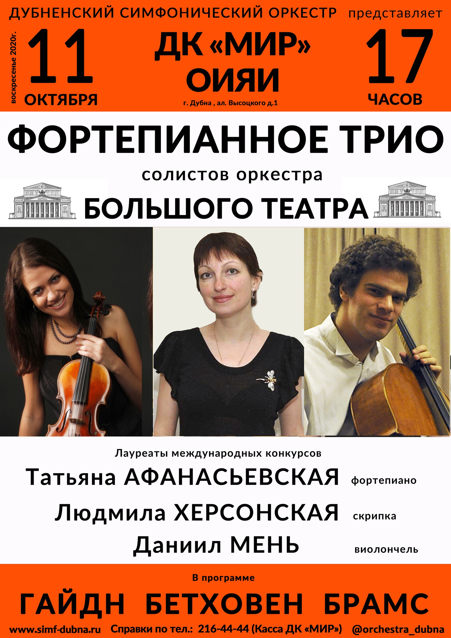 Дом культуры «Мир» ОИЯИ приглашает на концерт фортепианного трио солистов оркестра Большого театра.