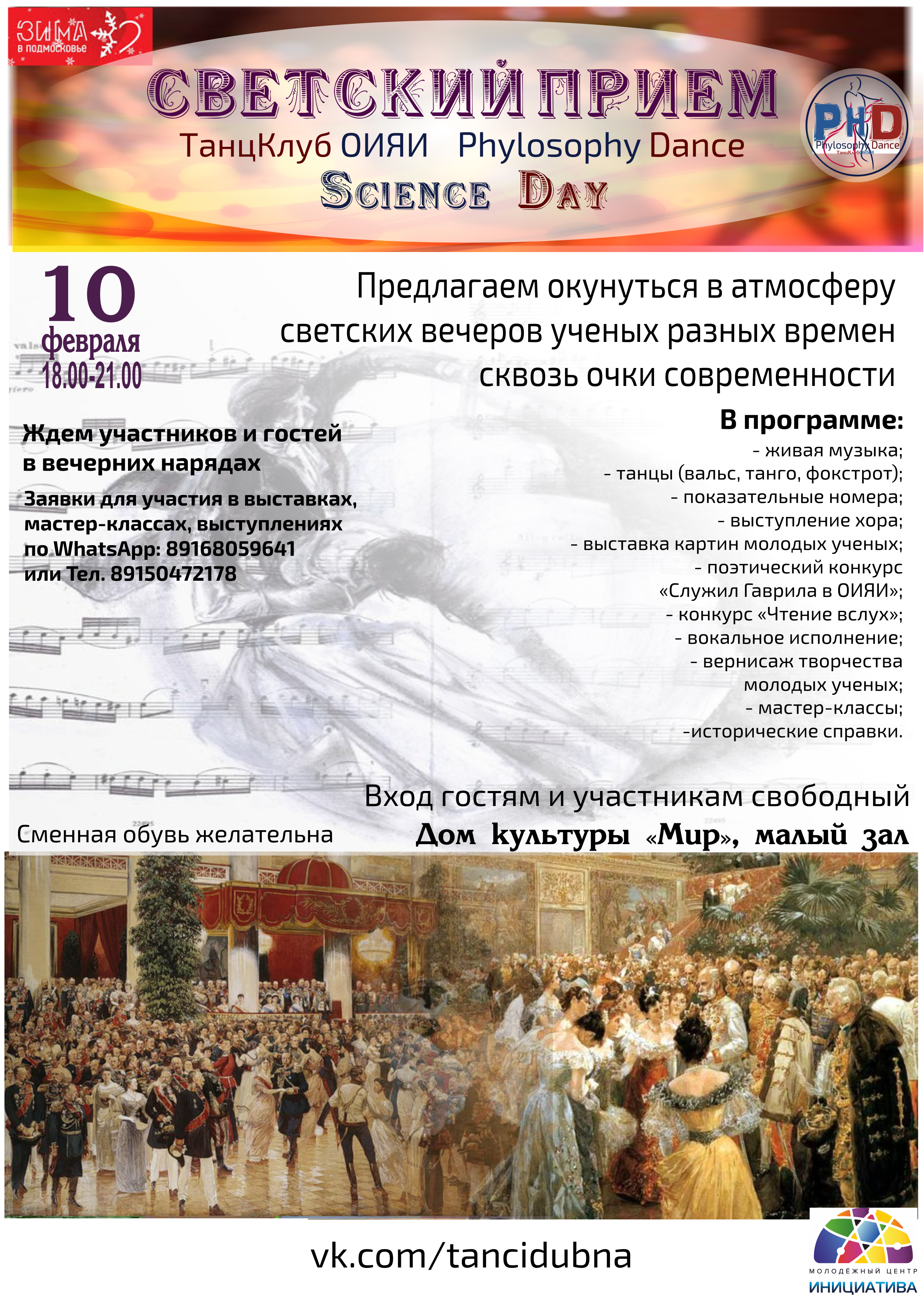 On 10 February 2019, at 6:00 PM, the JINR Dance Club “Phylosophy Dance” invites to take part in the gala evening “Science Day” dedicated to the Russian Science Day that will be held in the JINR Cultural Centre “Mir” (Small Hall).