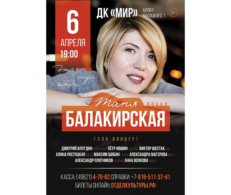 6 апреля 2018 года в 19.00 Дом культуры «Мир» ОИЯИ приглашает на гала-концерт Тани Балакирской и ее друзей. В программе джаз, соул, и инди.