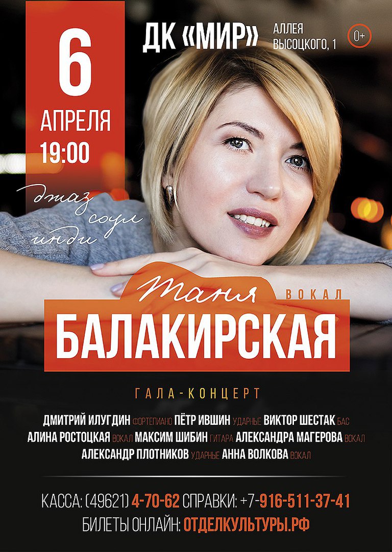 6 апреля 2018 года в 19.00 Дом культуры «Мир» ОИЯИ приглашает на гала-концерт Тани Балакирской и ее друзей. В программе джаз, соул, и инди.