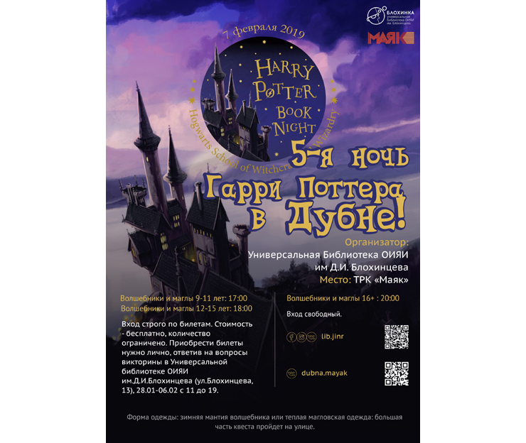 The fifth Harry Potter night will be held worldwide on 7 February 2019. In Dubna, this event will be organized for the 4th time by volunteers and staff members of the JINR Universal Public Library. This year, the “Mayak” mall is the lead sponsor of the event.