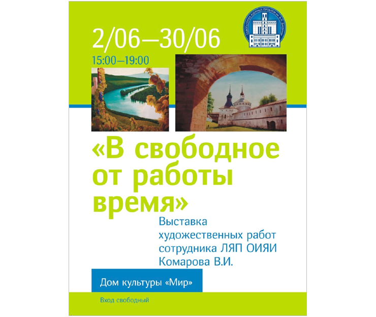 Со 2 по 30 июня 2021 г. Дом культуры «Мир» ОИЯИ ждет посетителей в своем выставочном зале на выставке художественных работ Владимира Ивановича Комарова, доктора физико-математических наук, главного научного сотрудника Лаборатории ядерных проблем ОИЯИ.