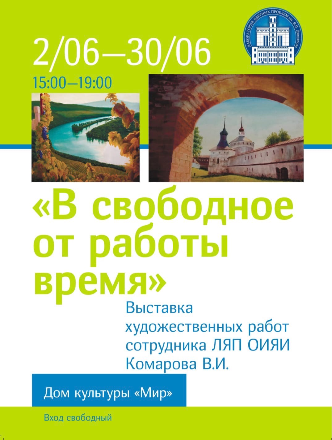 Со 2 по 30 июня 2021 г. Дом культуры «Мир» ОИЯИ ждет посетителей в своем выставочном зале на выставке художественных работ Владимира Ивановича Комарова, доктора физико-математических наук, главного научного сотрудника Лаборатории ядерных проблем ОИЯИ.