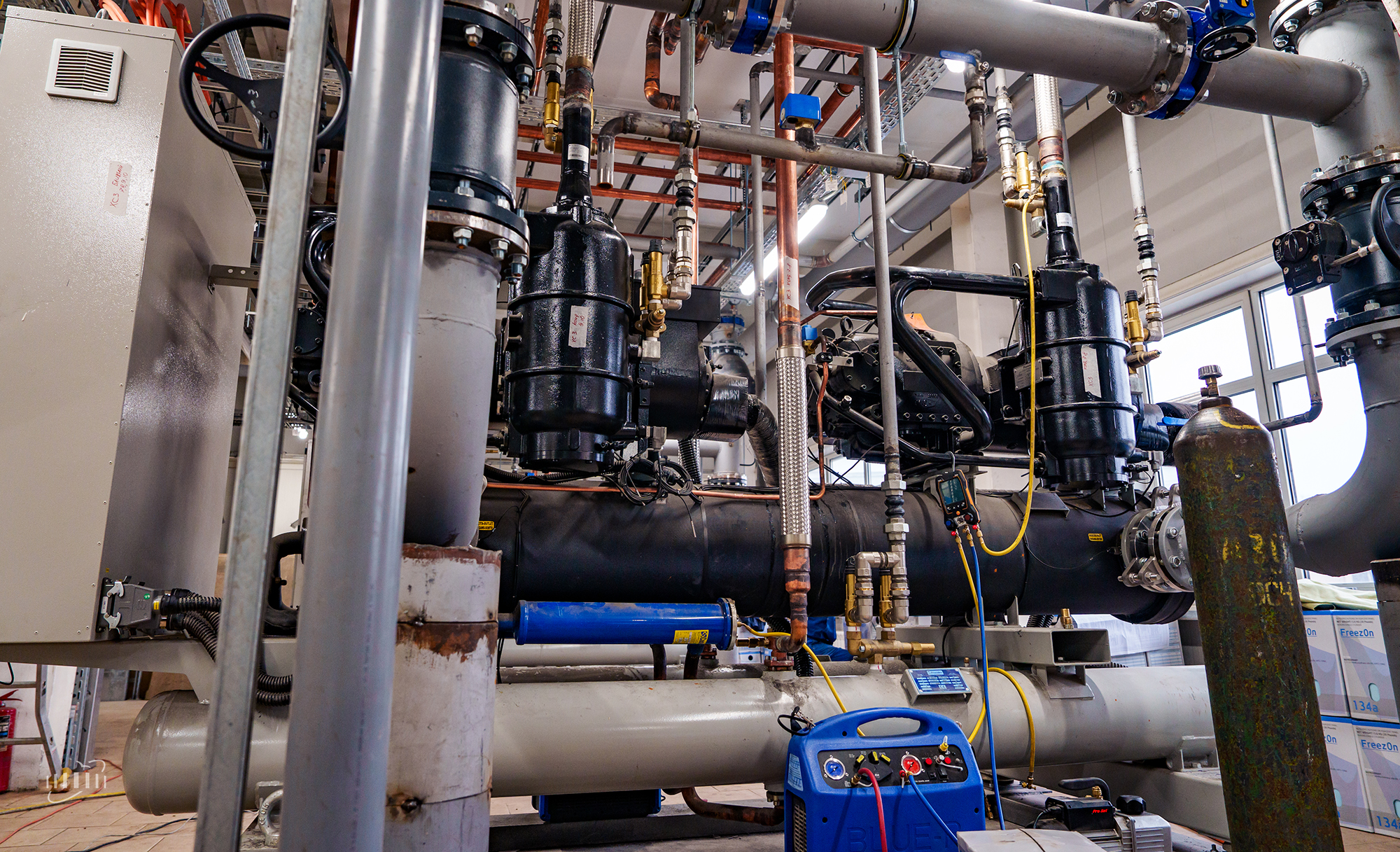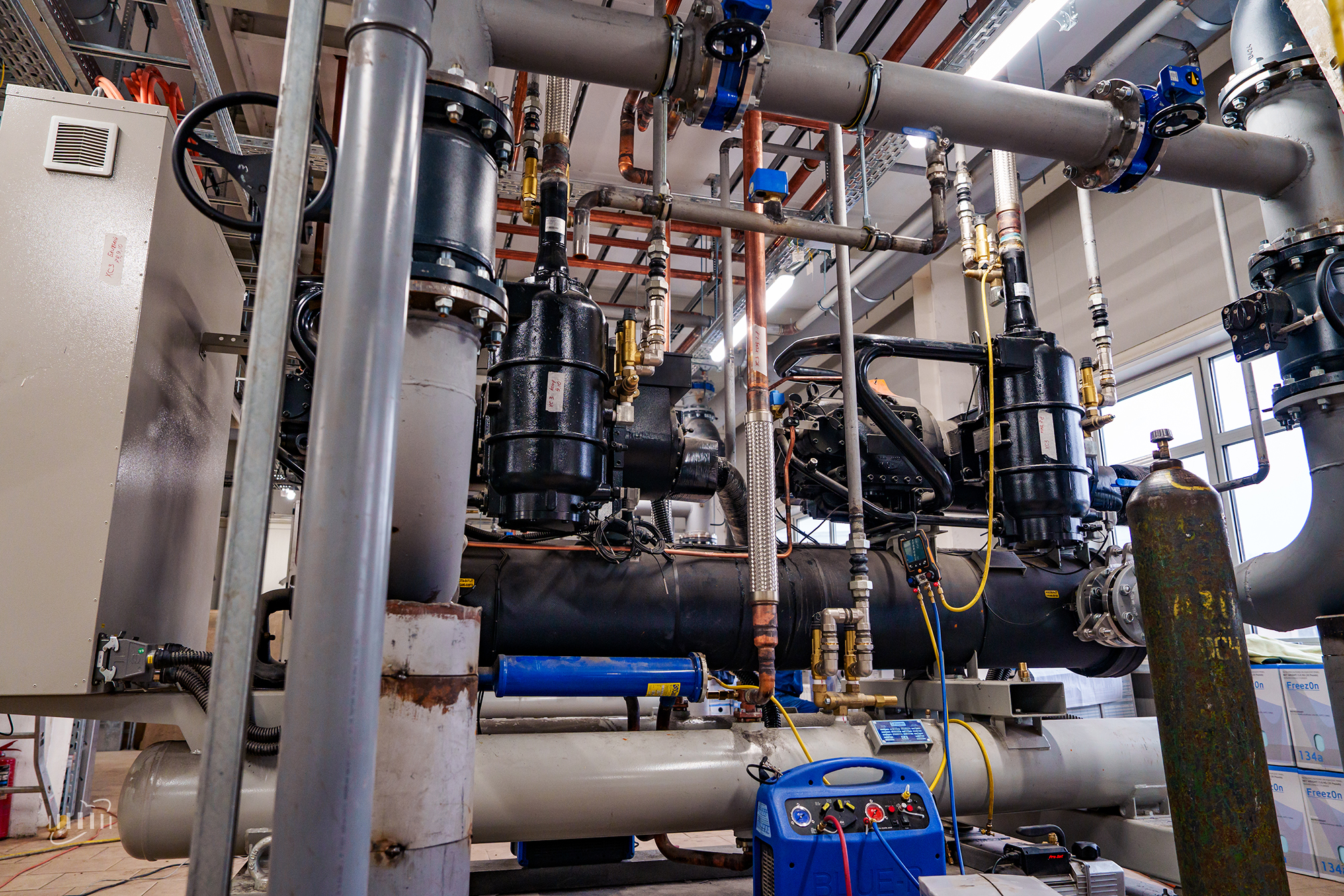 СС3 and WC3 ensure regular cooling and maintain the operating temperature of dipole magnets, stations of high-frequency accelerating systems, vacuum pumps, and other equipment in the eastern half-ring and beam transport channels. The CC3 Cooling Centre includes two chillers with a capacity of 850 kW each, outdoor condensing units, dry coolers located on the roof of the experimental pavilion, and other auxiliary equipment.