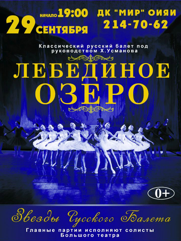 Дом культуры «Мир» ОИЯИ приглашает 29 сентября 2017 г. в 19.00 часов на Классический русский балет под руководством Х. Усманова «Лебединое озеро». Главные партии исполняют солисты Большого театра. 0+.