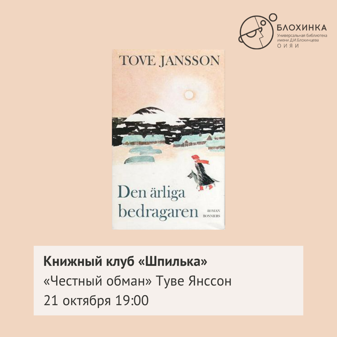 Универсальная библиотека ОИЯИ приглашает на встречу книжного клуба «Шпилька»: обсуждаем книги, написанные женщинами о женщинах. «Честный обман» (Т. Янссон).