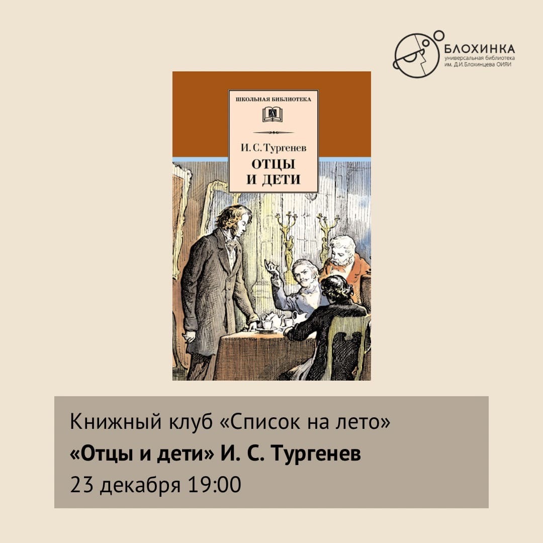 Универсальная библиотека ОИЯИ приглашает на встречу книжного клуба «Список на лето»: перечитываем взрослыми глазами произведения школьной программы. Обсуждаем роман И. С. Тургенева «Отцы и дети».