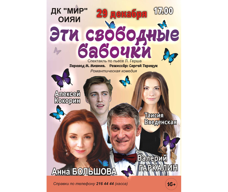 29 декабря 2019 г. в 17:00 часов Дом культуры «Мир» ОИЯИ приглашает на романтическую комедию «Эти свободные бабочки» по пьесе Л. Герша.