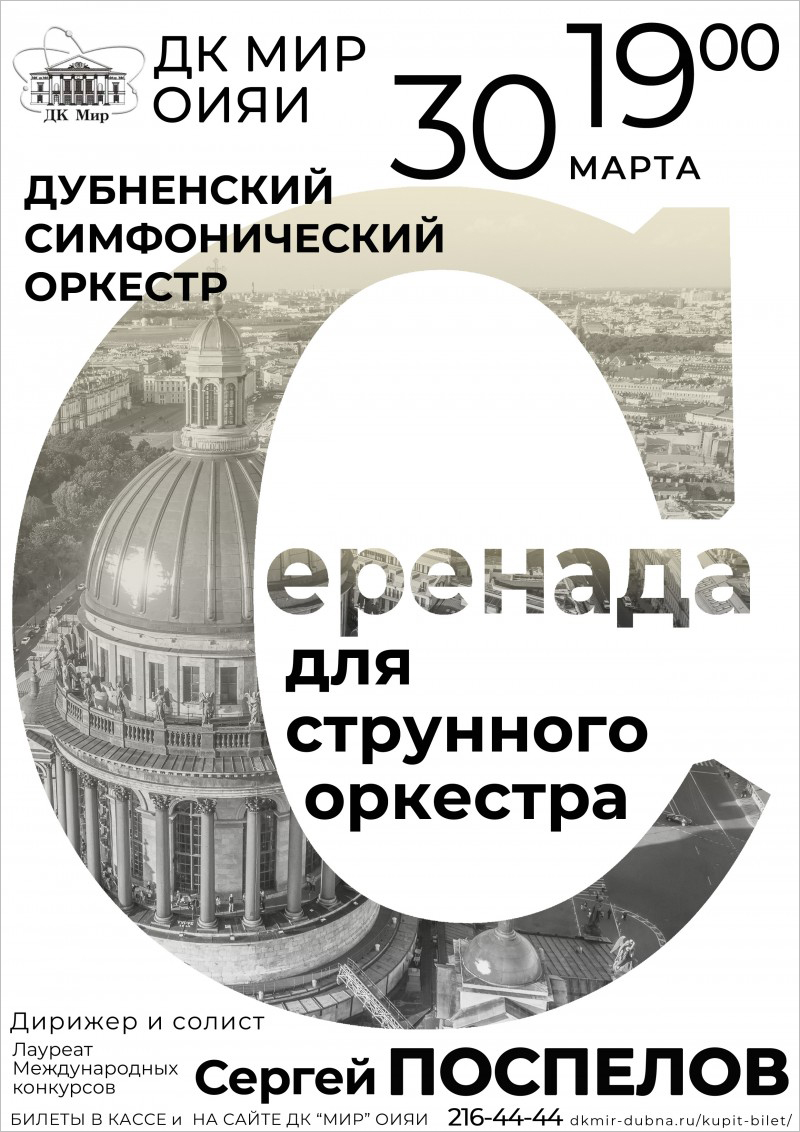 30 марта в 19:00 в Доме культуры «Мир» ОИЯИ состоится концерт Дубненского симфонического оркестра «Серенада для струнного оркестра».