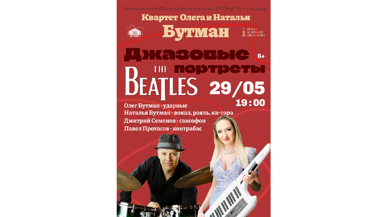 29 мая 2026 г. в 19:00 в рамках фестиваля променад-концертов «Белые ночи в Дубне» в ДК «Мир» ОИЯИ состоится концерт «Джазовые портреты The Beatles».